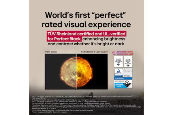 Perfect Black is UL-verified and delivers true black levels to enhance perceived brightness and contrast. Also has earned UL eyesafe verification for a more comfortable watching experience by reducing blue light emissions.